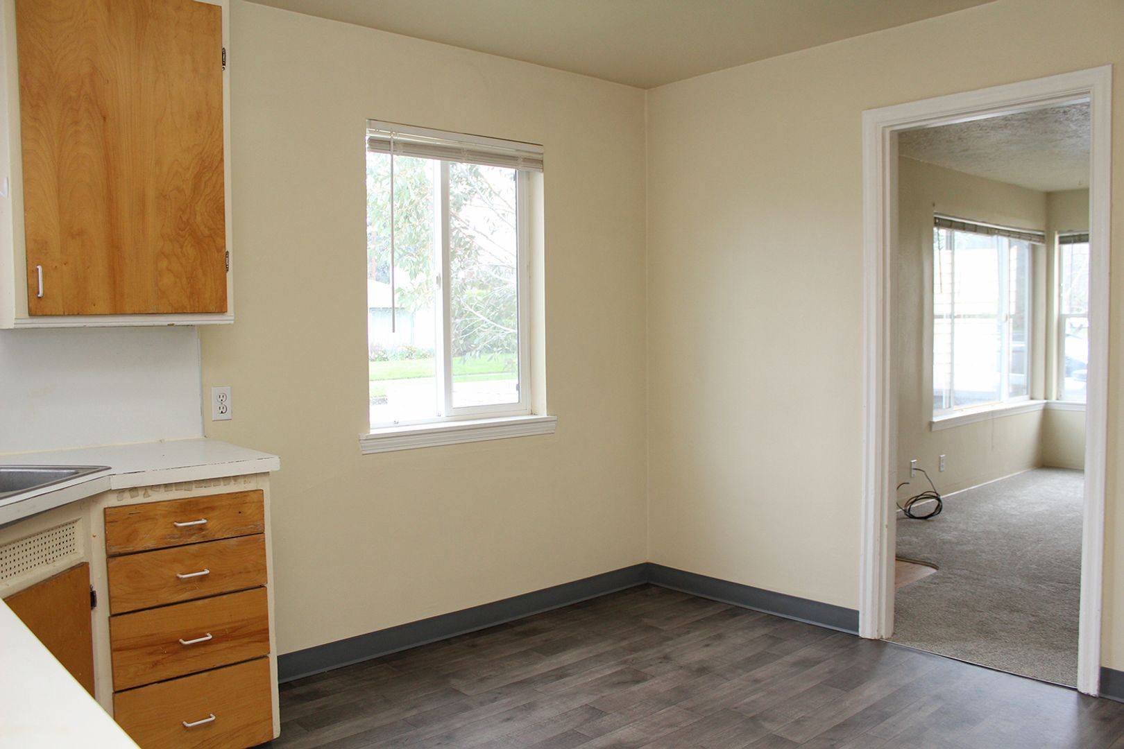 - Carpet throughout, with engineered wood floors in Kitchen and Bathroom