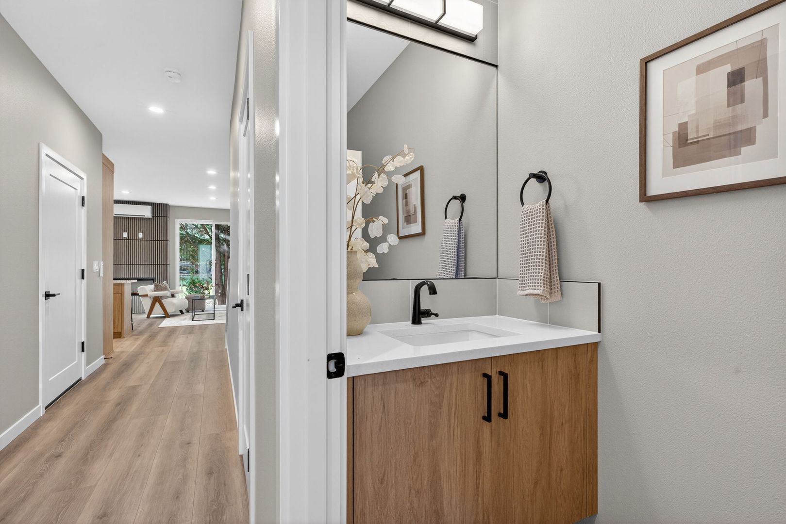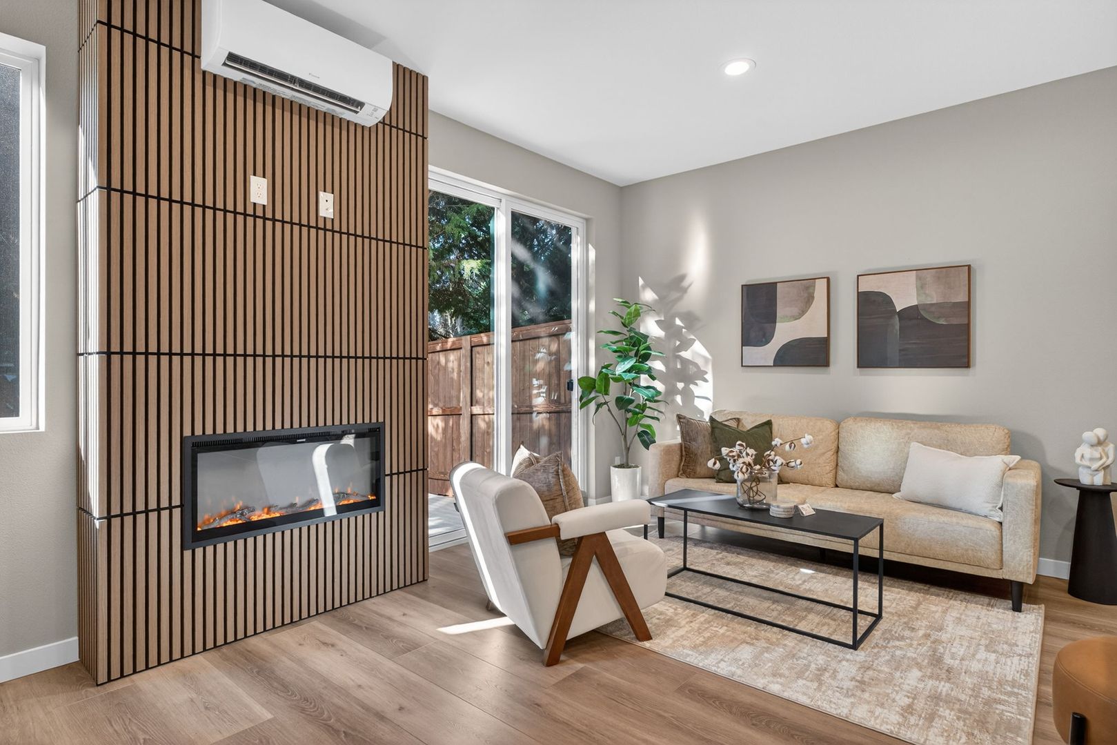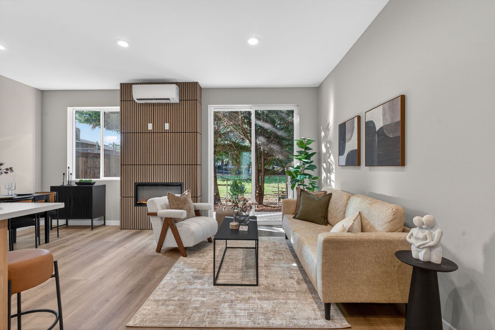 • Open and modern floorplan with open living area including an electric fireplace.