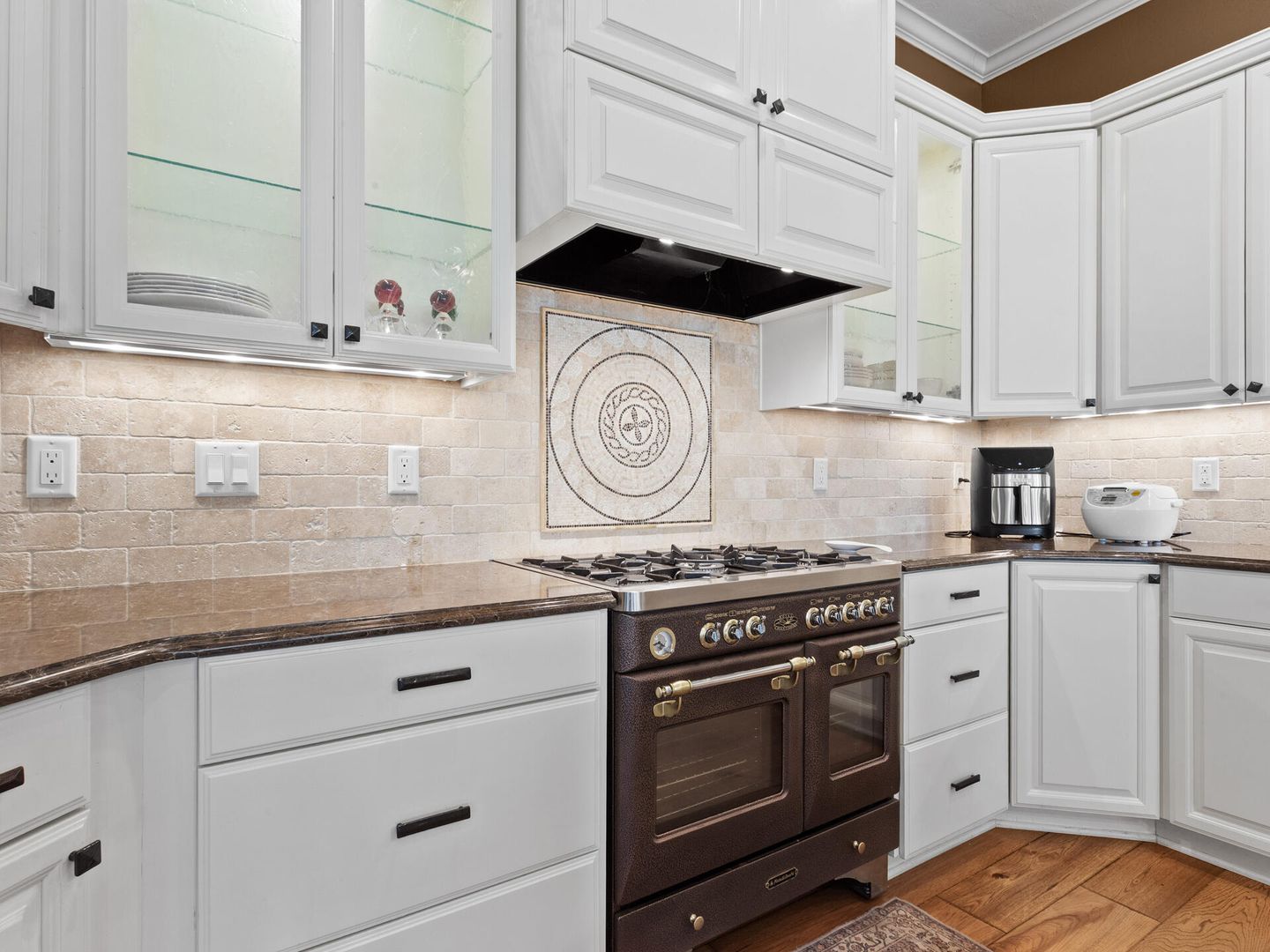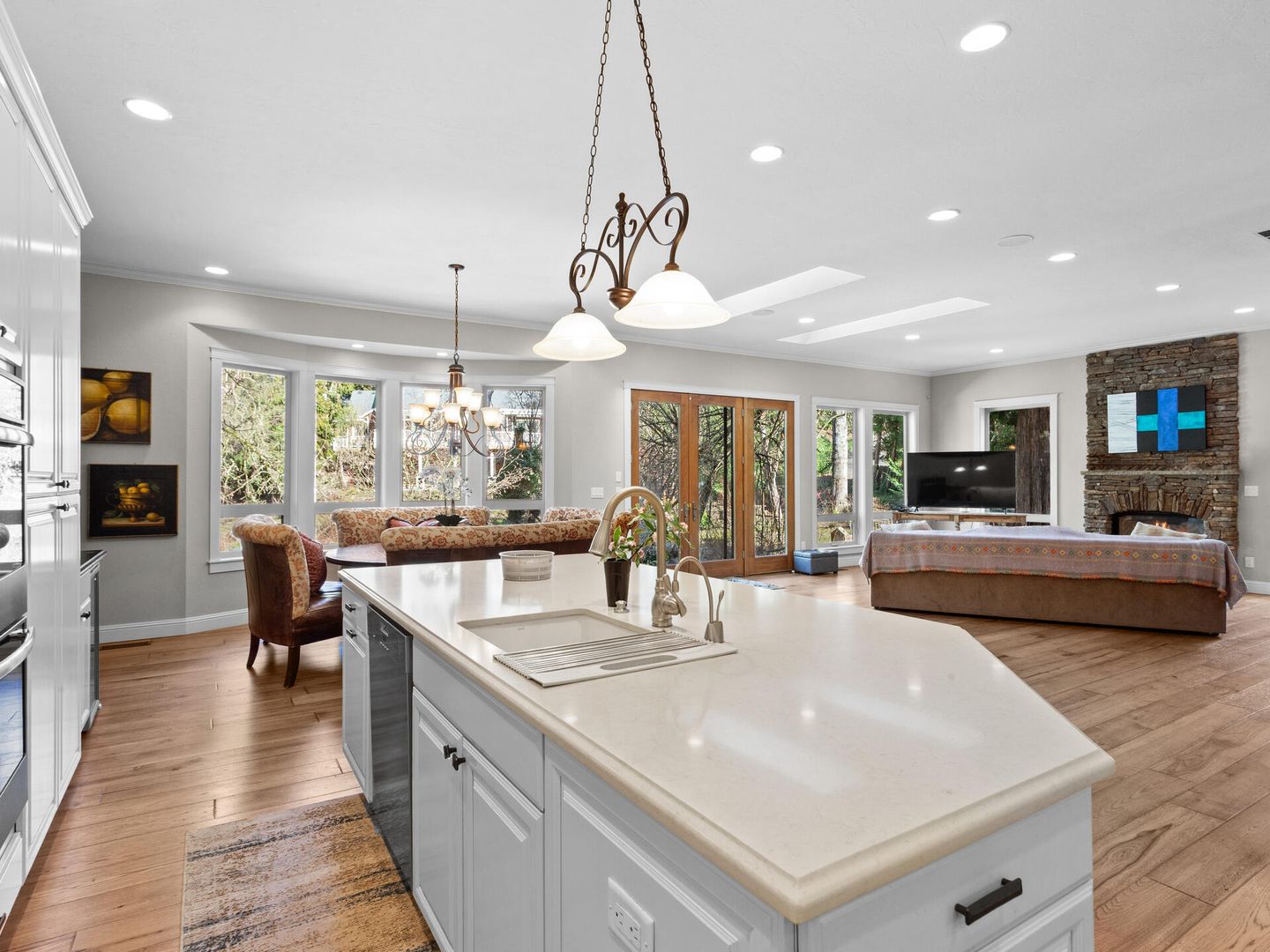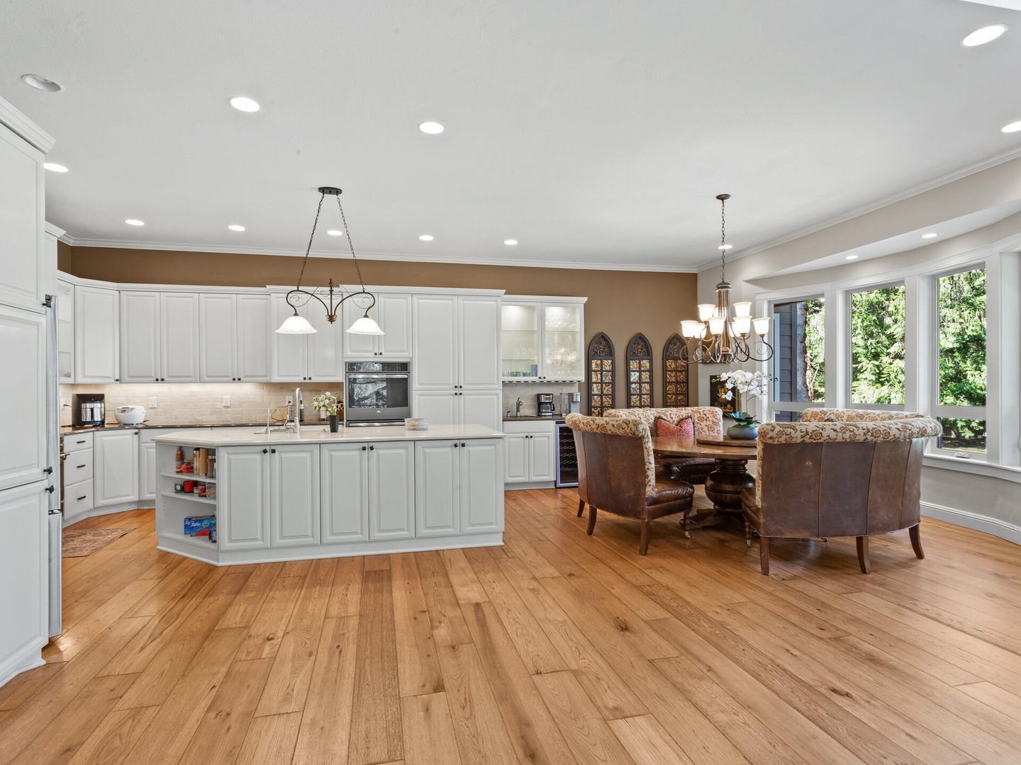 • Custom kitchen with triple ovens, quartz counters, stainless appliances, bay window nook.
