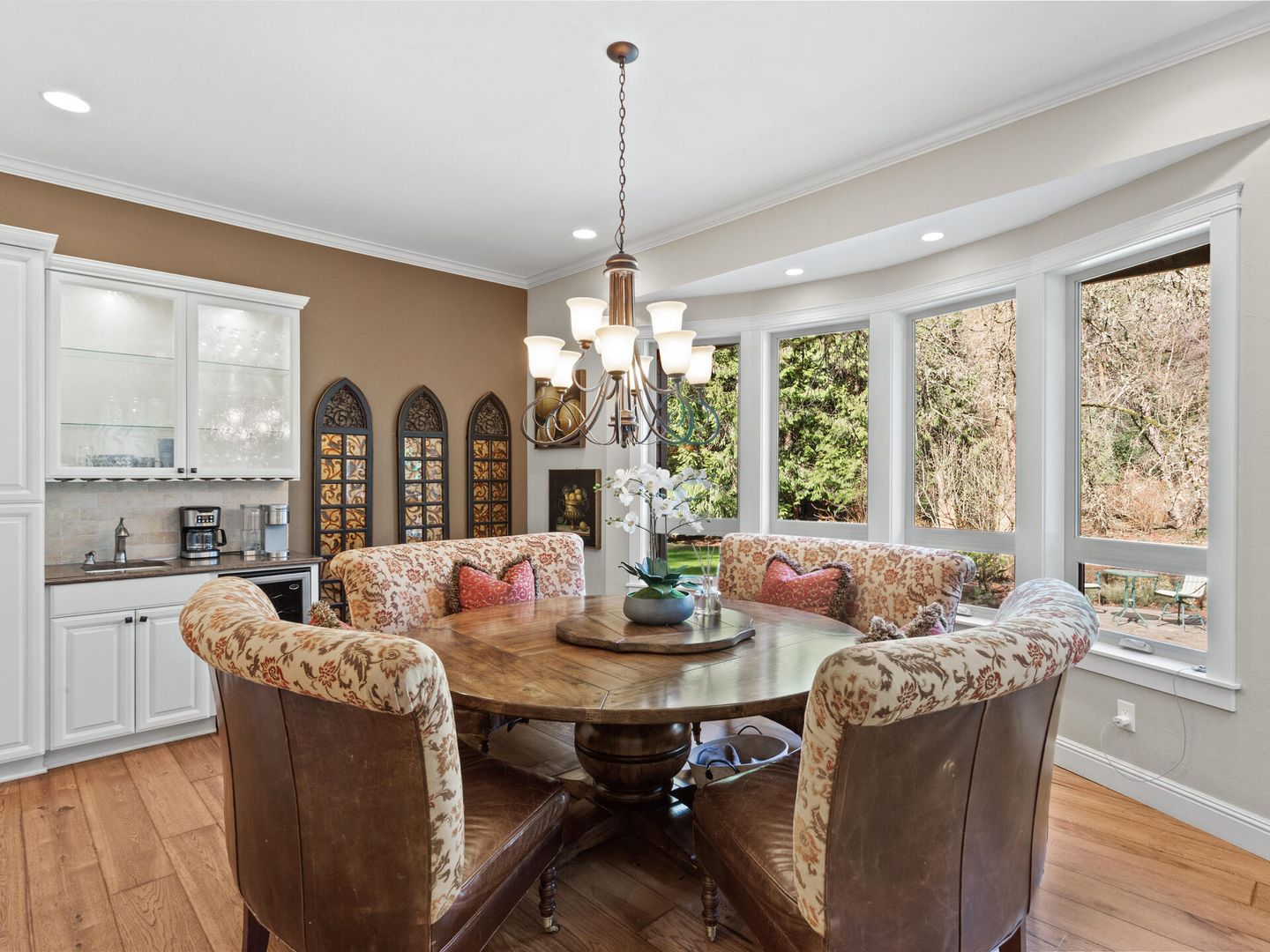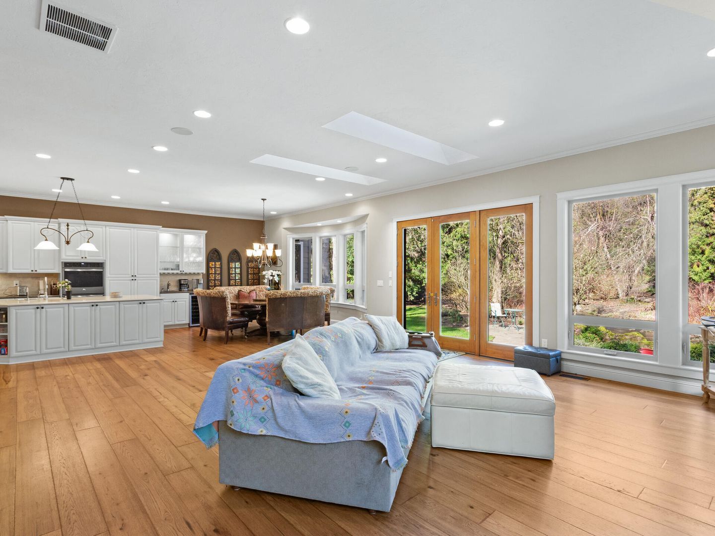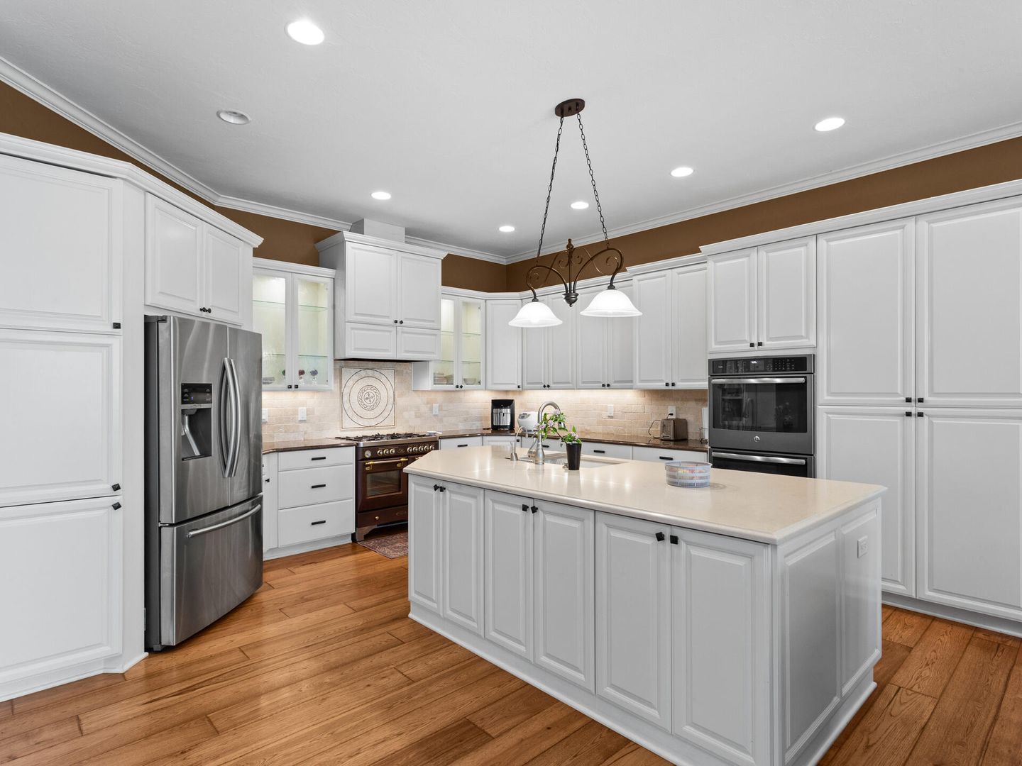 • Custom kitchen with triple ovens, quartz counters, stainless appliances, bay window nook.