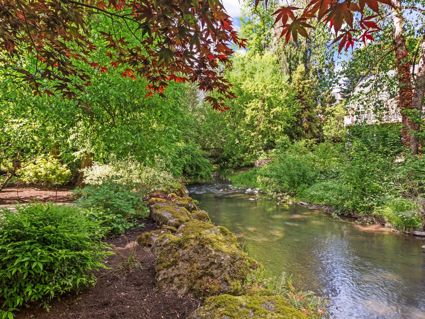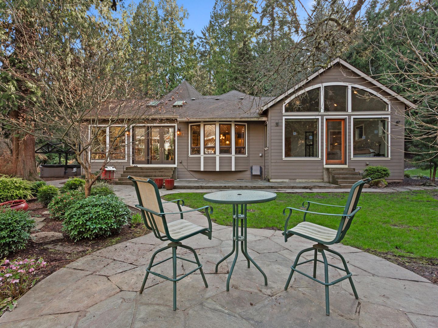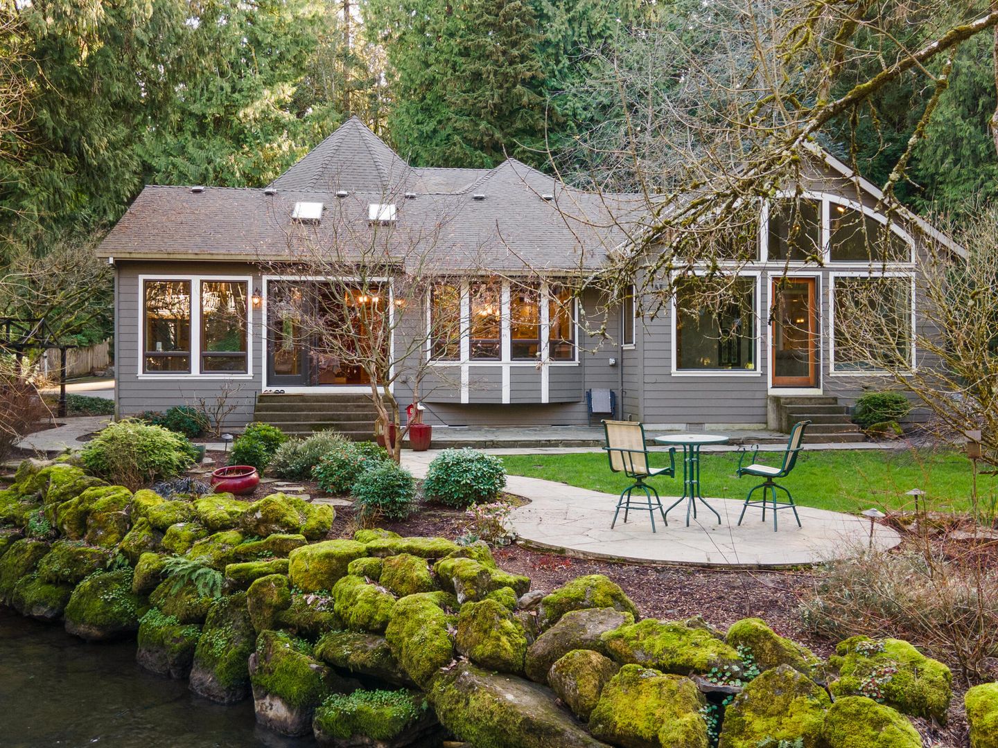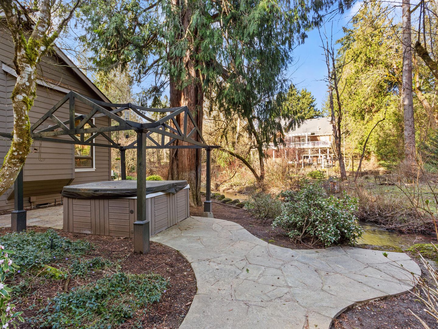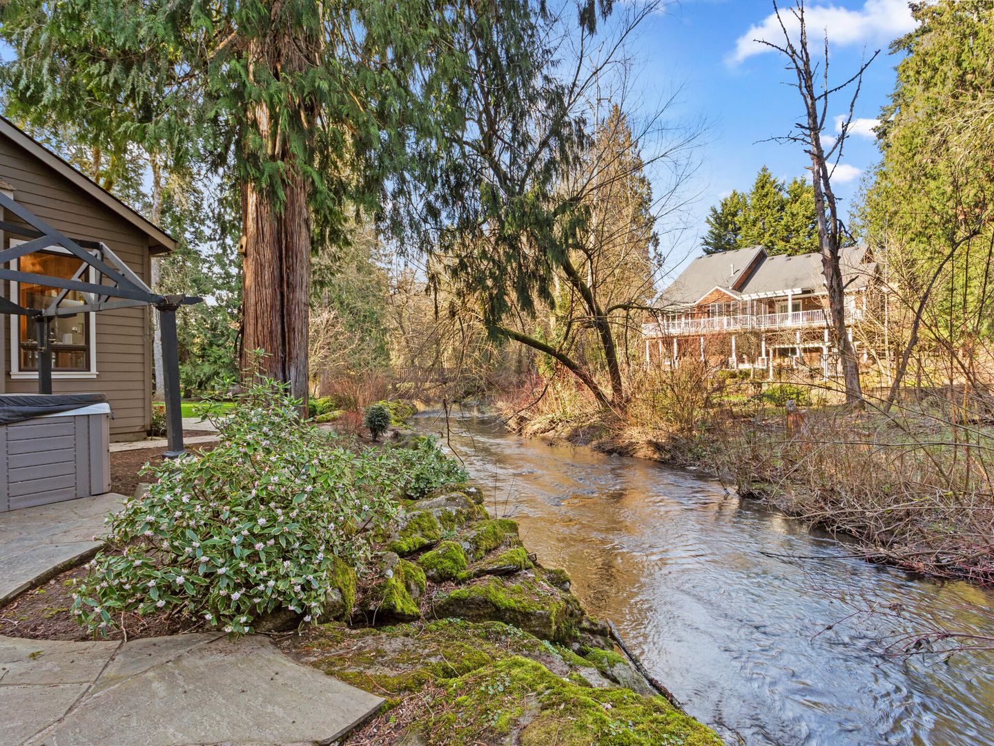 • Over 1 acre level lot with flagstone patio, gazebo, hot tub, all overlooking the gorgeous peaceful stream.