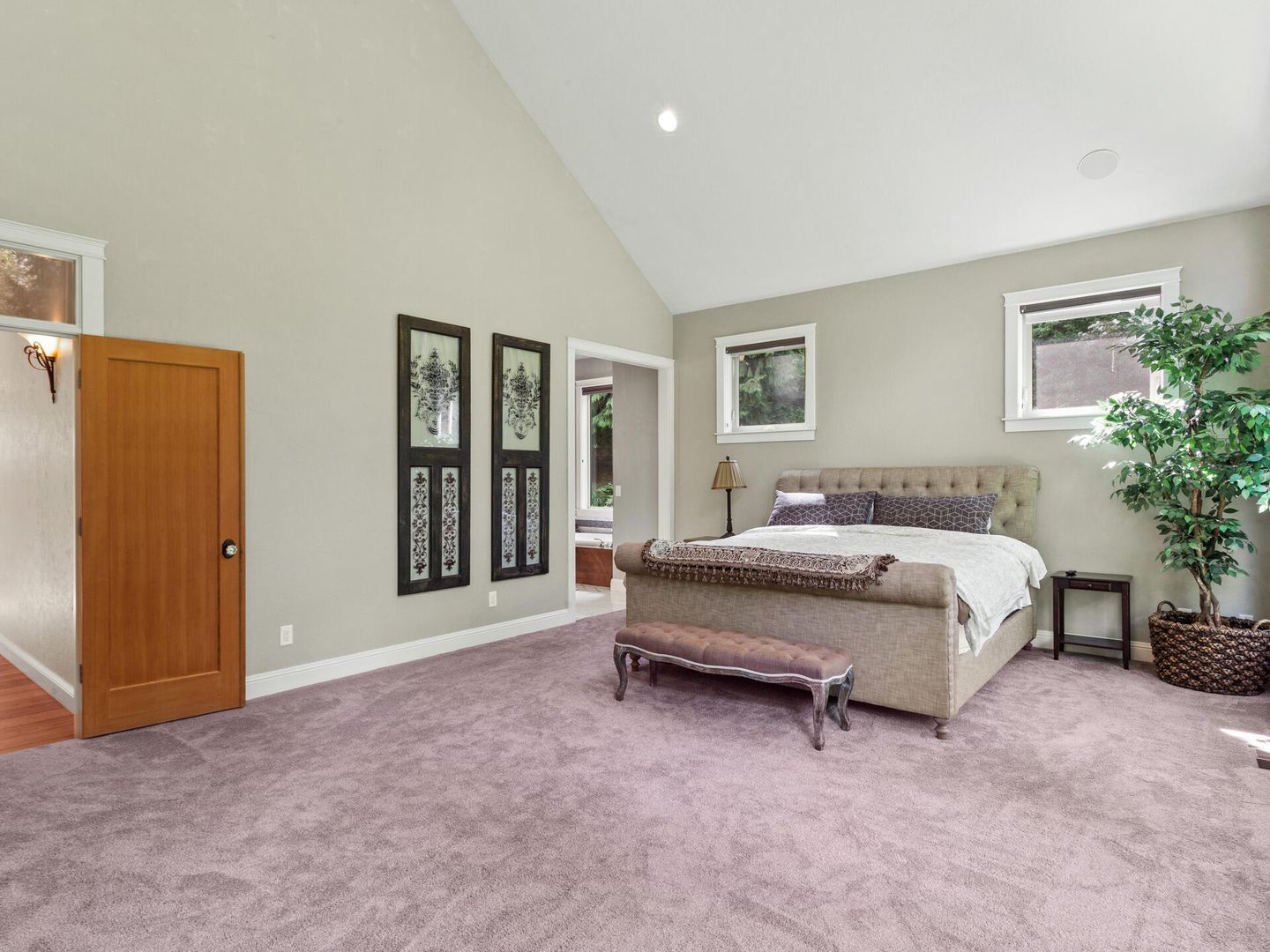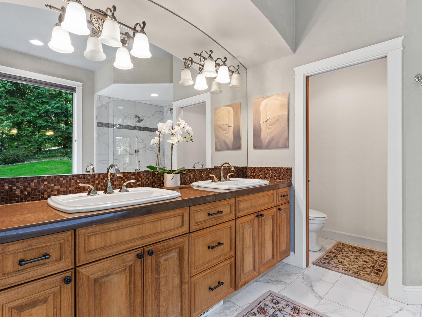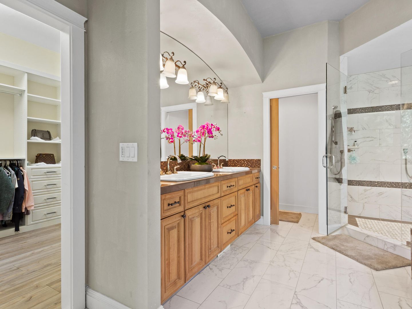 • Incredible Primary Suite with vaulted ceilings, walk-in closet with custom organizers, marble floors, soaking tub, dual sinks and tiled shower.