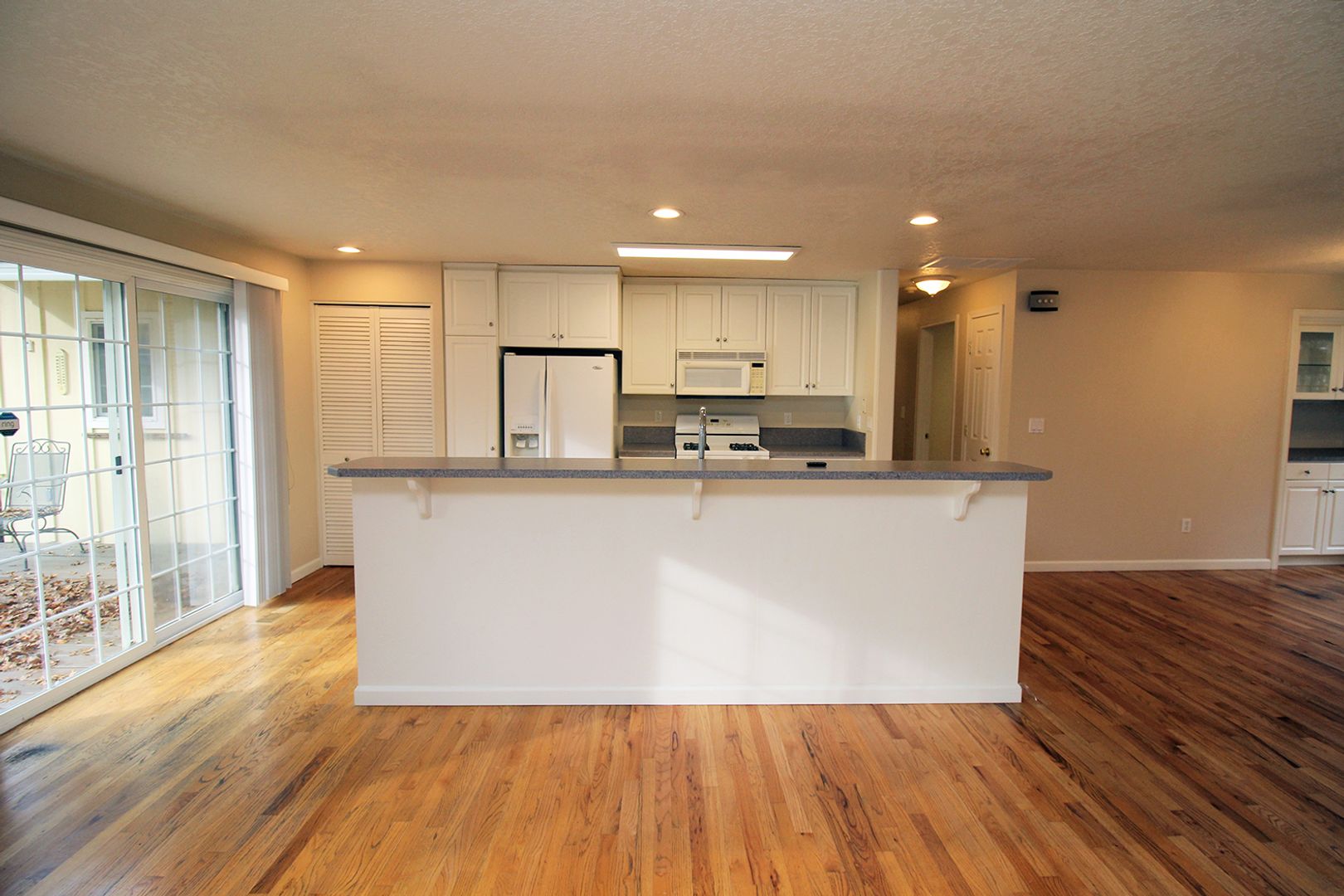 • Open Kitchen with island, large eating bar, and newer appliances with gas range