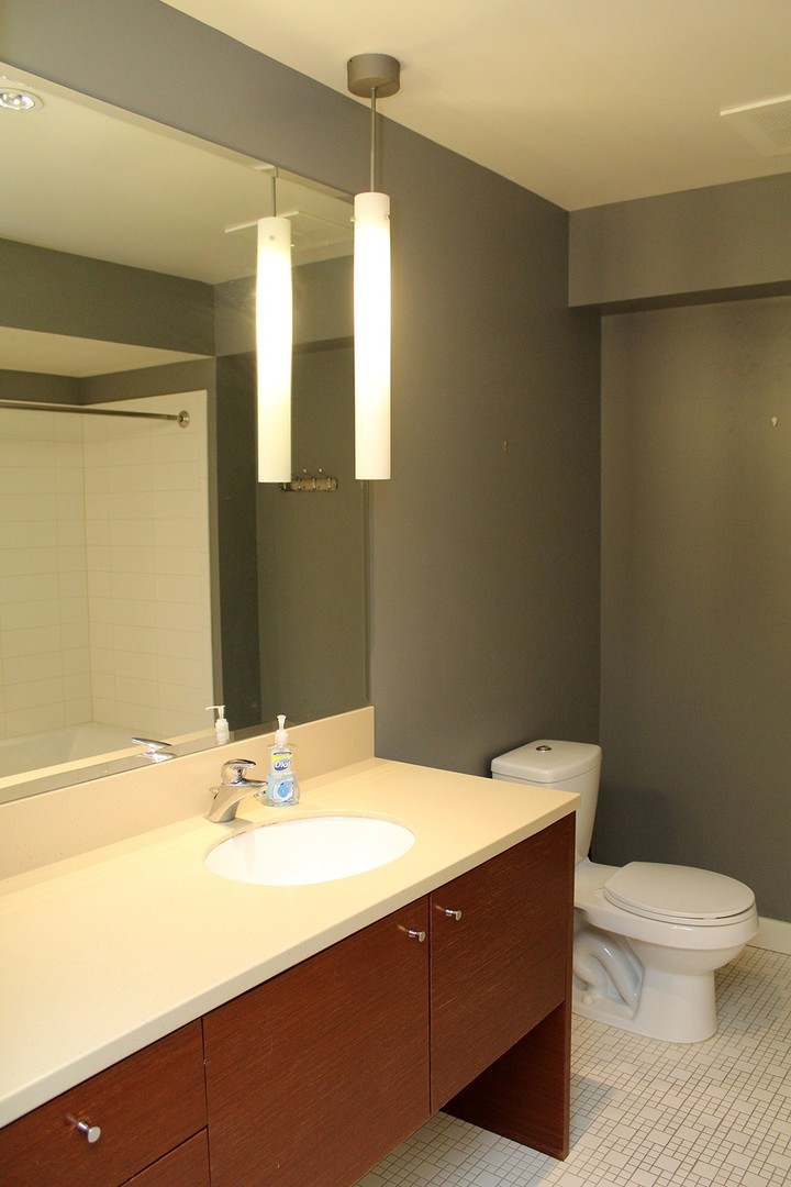 -Solid-surface counter tops, spacious dark cabinets, and other high-end finishes