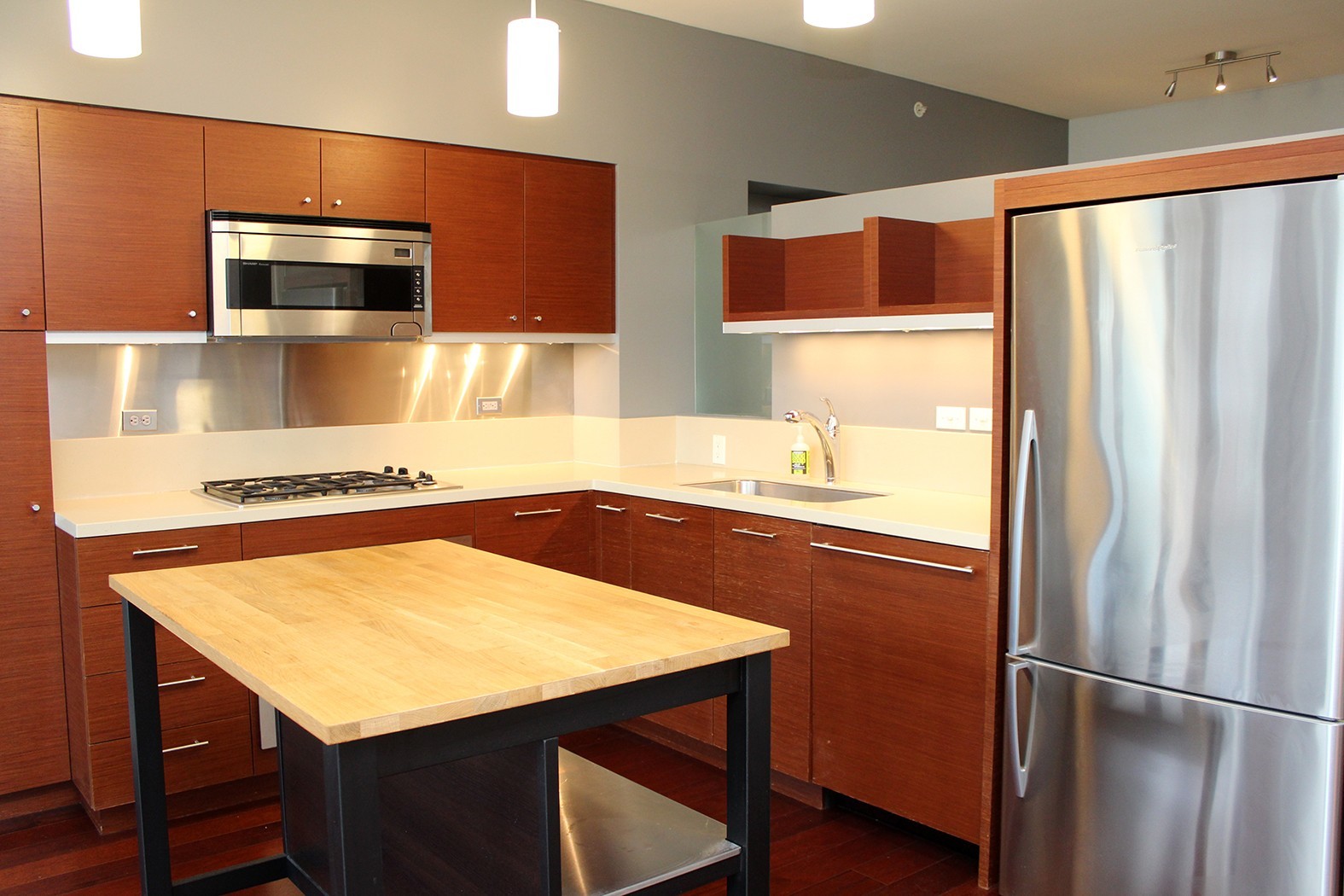 -Well equipped kitchen with all stainless steel appliances, including built-in microwave, gas range, and island table