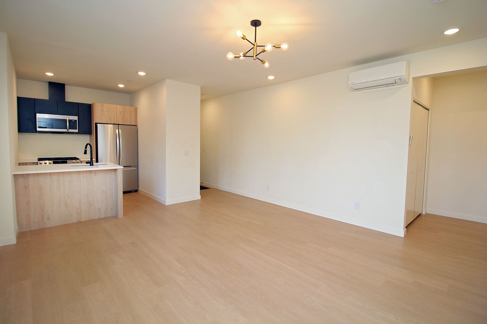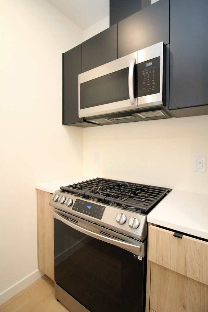 • Open cook’s Kitchen with quartz counters, stainless appliances, gas range, built-in microwave and breakfast bar