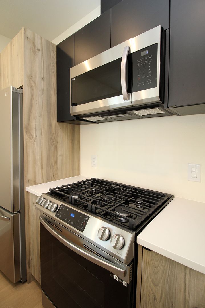 • Open cook’s Kitchen with quartz counters, stainless appliances, gas range, built-in microwave and breakfast bar
