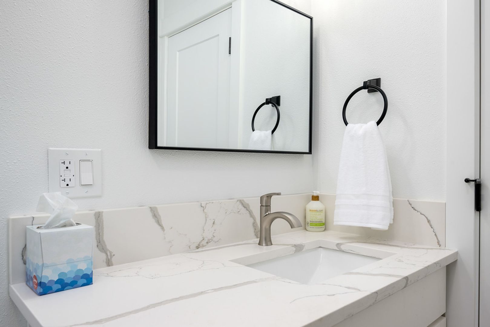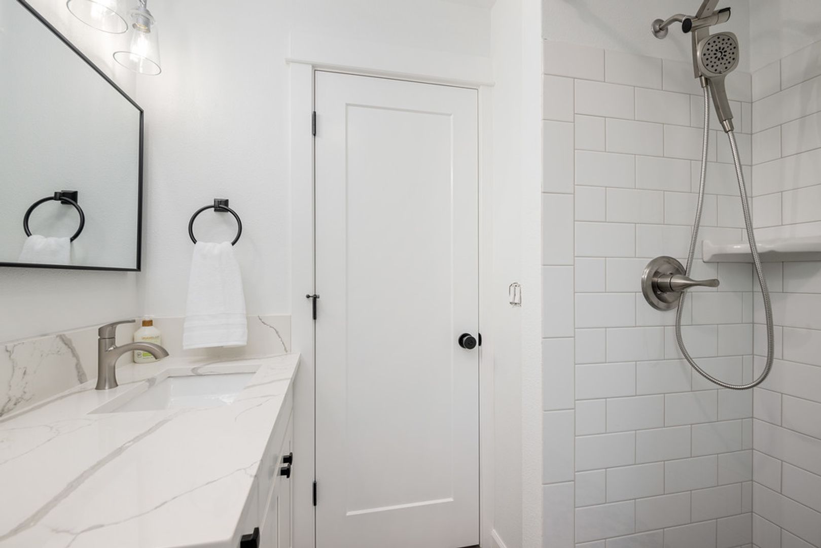 • New Bathroom features quartz-topped vanity, large subway-tiled shower with dual shower heads!