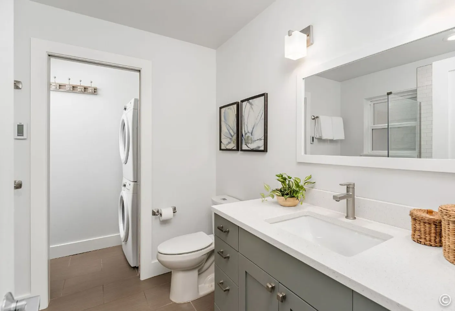 -Beautiful bathroom with tiled shower that leads to storage closet with stacked BRAND NEW washer and dryer