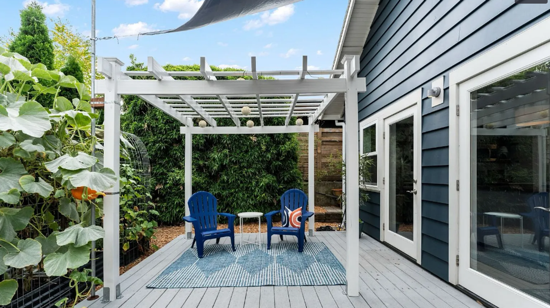 -Lovely outdoor space, separated entirely from the main house for those upcoming summer days. Large planters included + Large storage shed