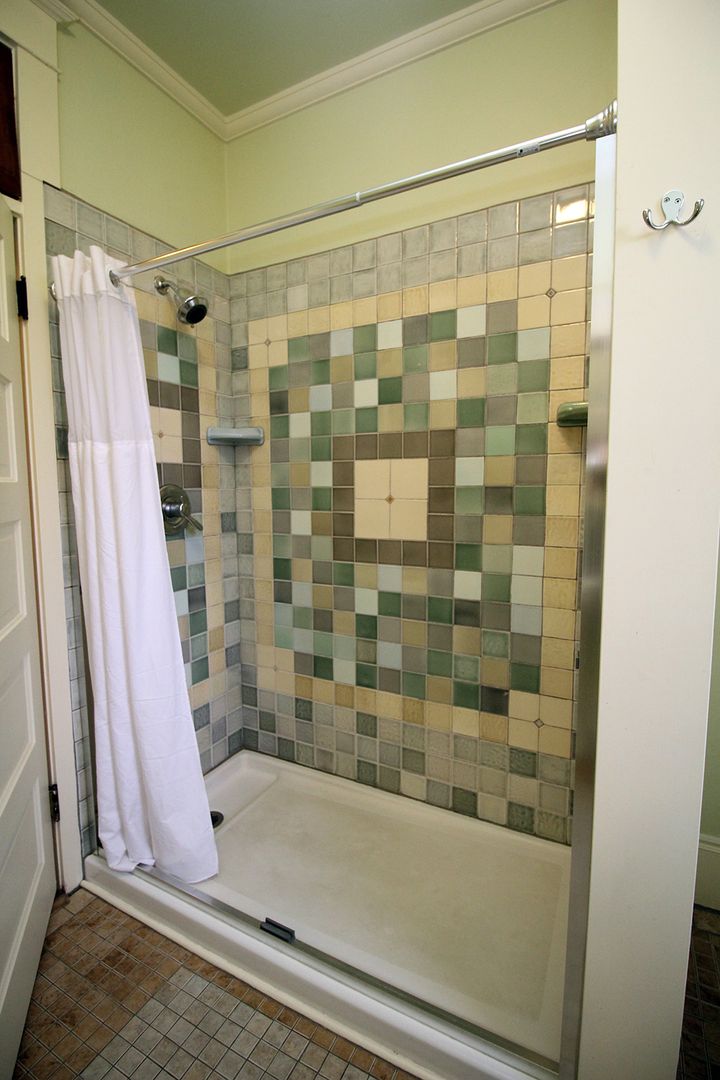 • Bathroom features pedestal sink and unique tiled step-in shower