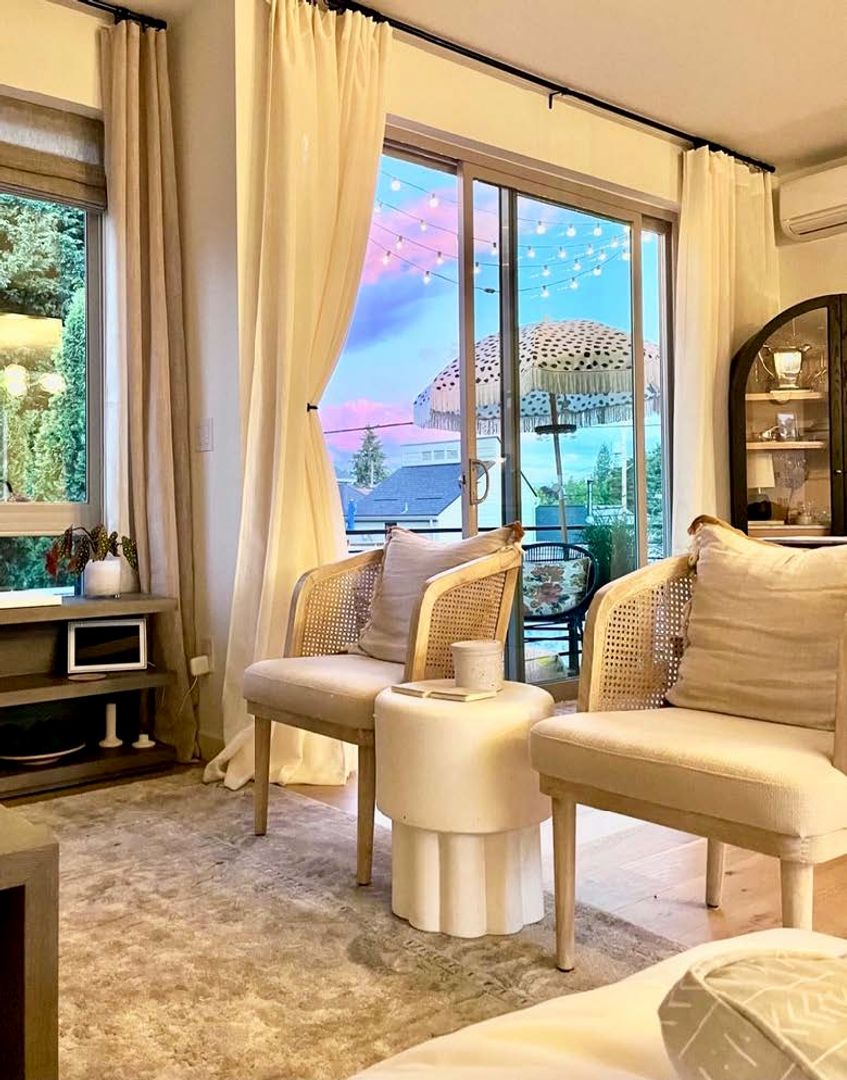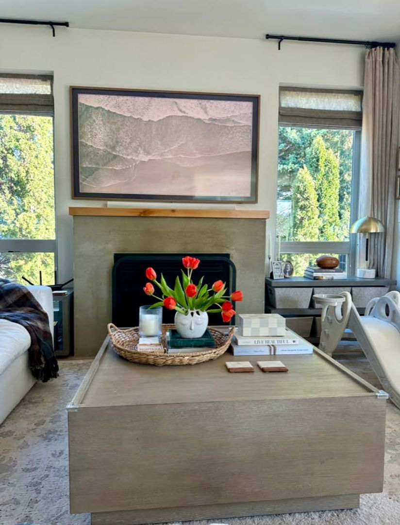 Inside, clean architectural lines meet warm natural materials. Wide-plank hardwood floors, custom cabinetry, designer tile, and brass fixtures elevate every room. The open-concept main level flows seamlessly to the private deck, creating an effortless indoor-outdoor lifestyle. The living room is anchored by a contemporary fireplace and framed by oversized windows overlooking lush greenery. The kitchen features quartz countertops, open wood shelving, and thoughtful storage which are both functional and beautiful.