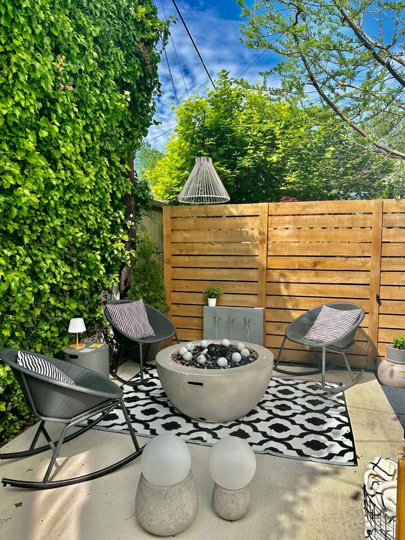 The fully fenced patio is a true extension of the home with ivy-covered walls, ambient string lighting, a dining area beneath a scalloped umbrella, and a modern fire pit and water feature