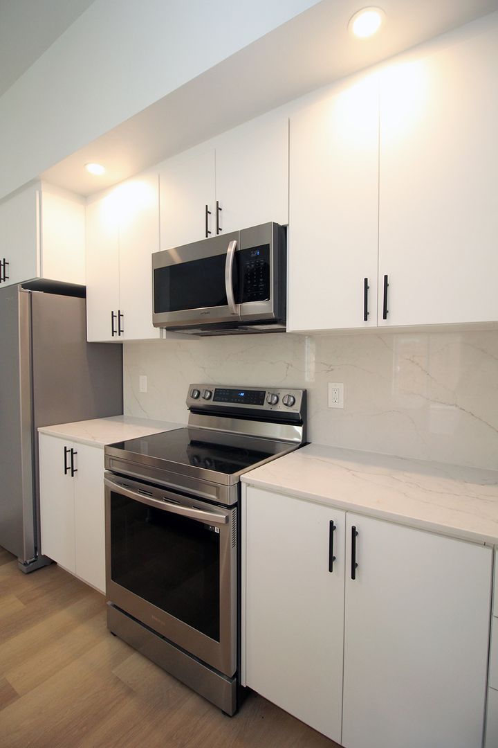 • Kitchen features stainless appliances, quartz counters and backsplashes and a great island with eating bar
