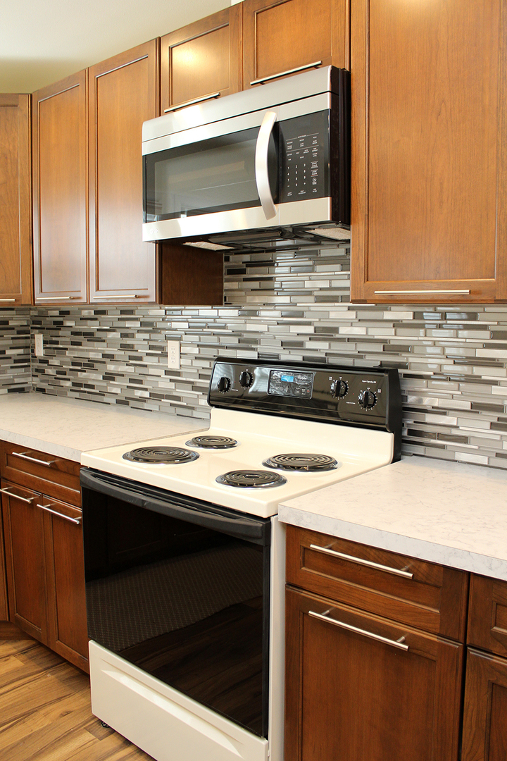 • Gorgeous open kitchen with Island, tiled backsplash and updated appliances