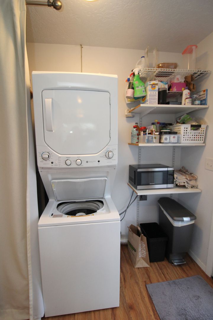 • Utility Room off Kitchen with stacked washer and dryer and door to side patio
