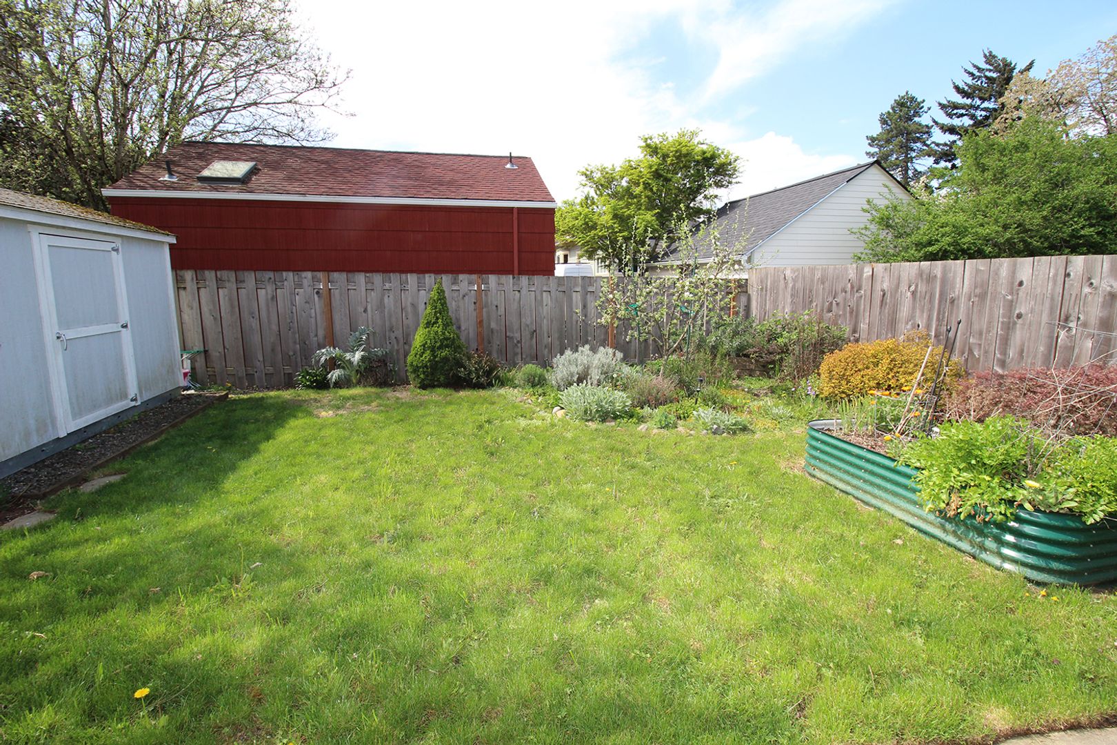 • Incredible fenced back yard with stamped concrete patio, raised garden beds, mature plantings and a nice garden shed.