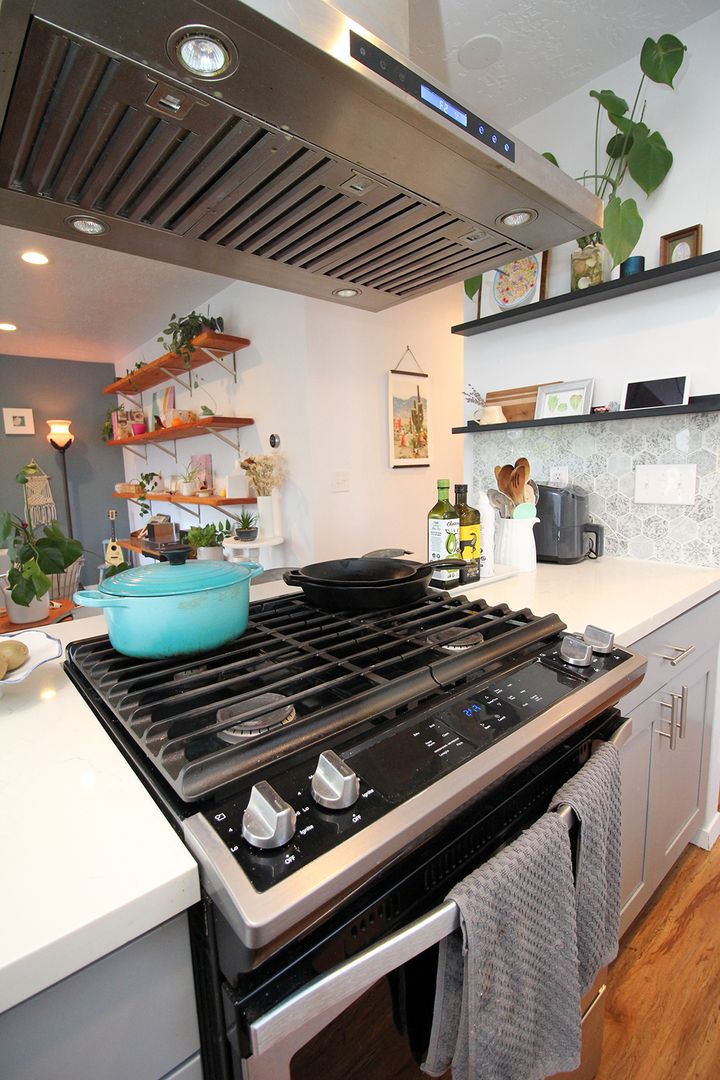 • Open Kitchen features white quartz counters, hi-end stainless appliances, pro-series gas range, tiled backsplashes and a large eating bar.
