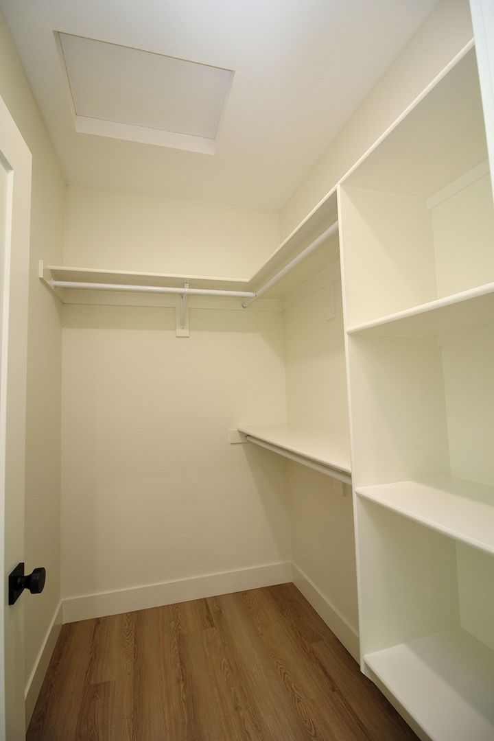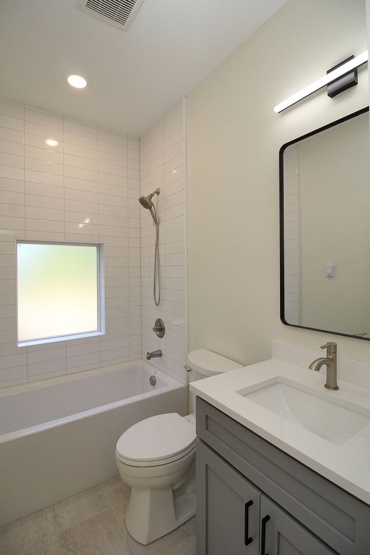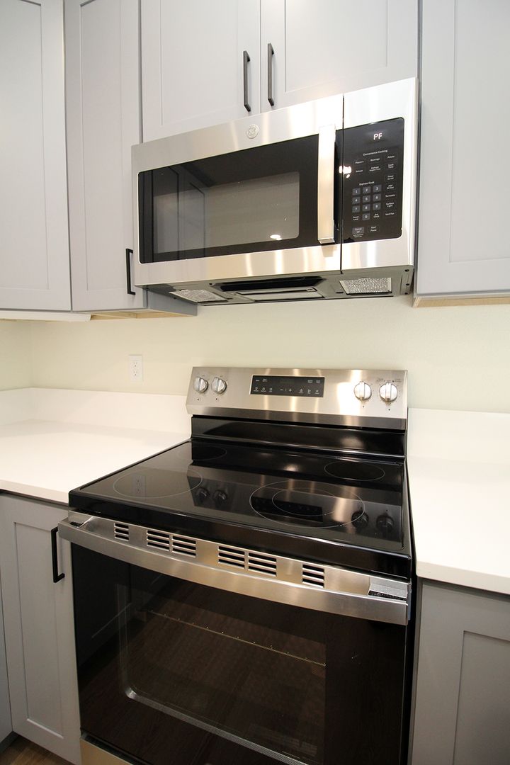 • Kitchen features slab quartz counters and stainless appliances with lots of cabinet storage