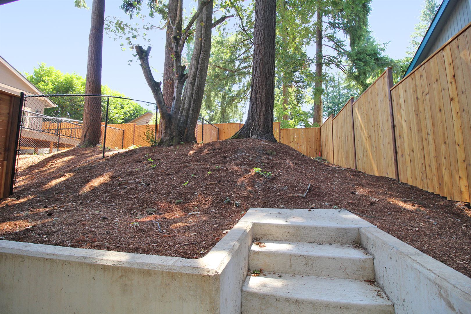 • Covered back patio with steps up to fenced natural back yard area with large fir trees