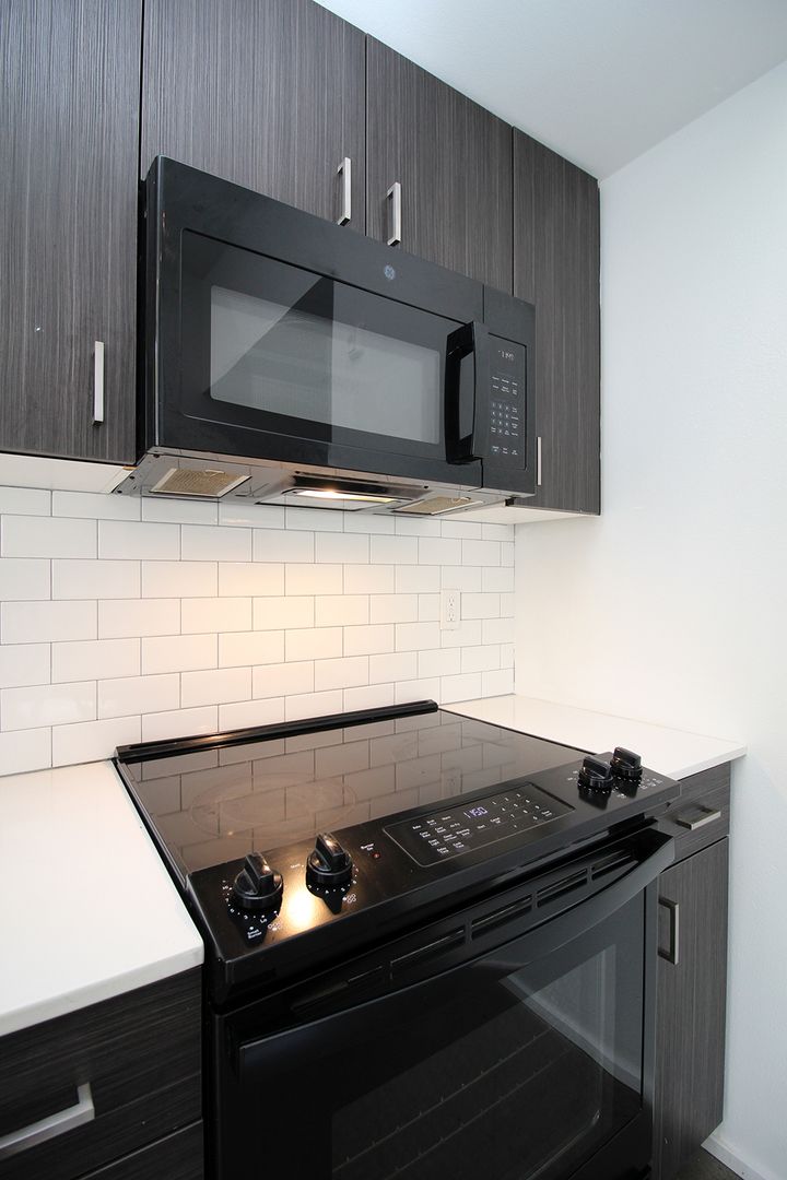 • Large open Kitchen with matching upscale appliances, including dishwasher, microwave, and flat top electric stove, solid surface counters with subway tile backsplash, and lots of cabinet/storage space
