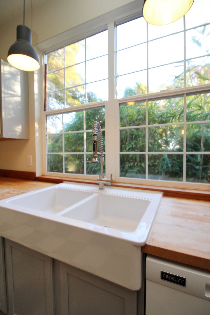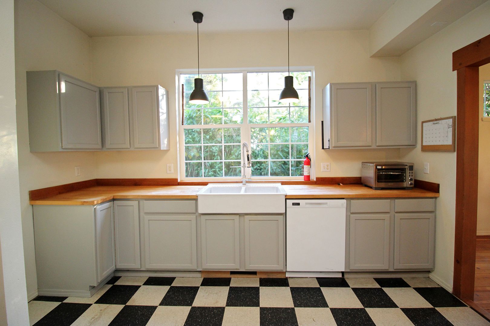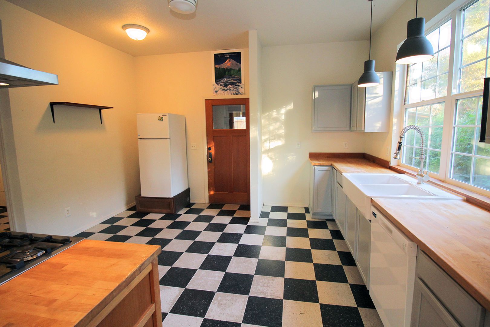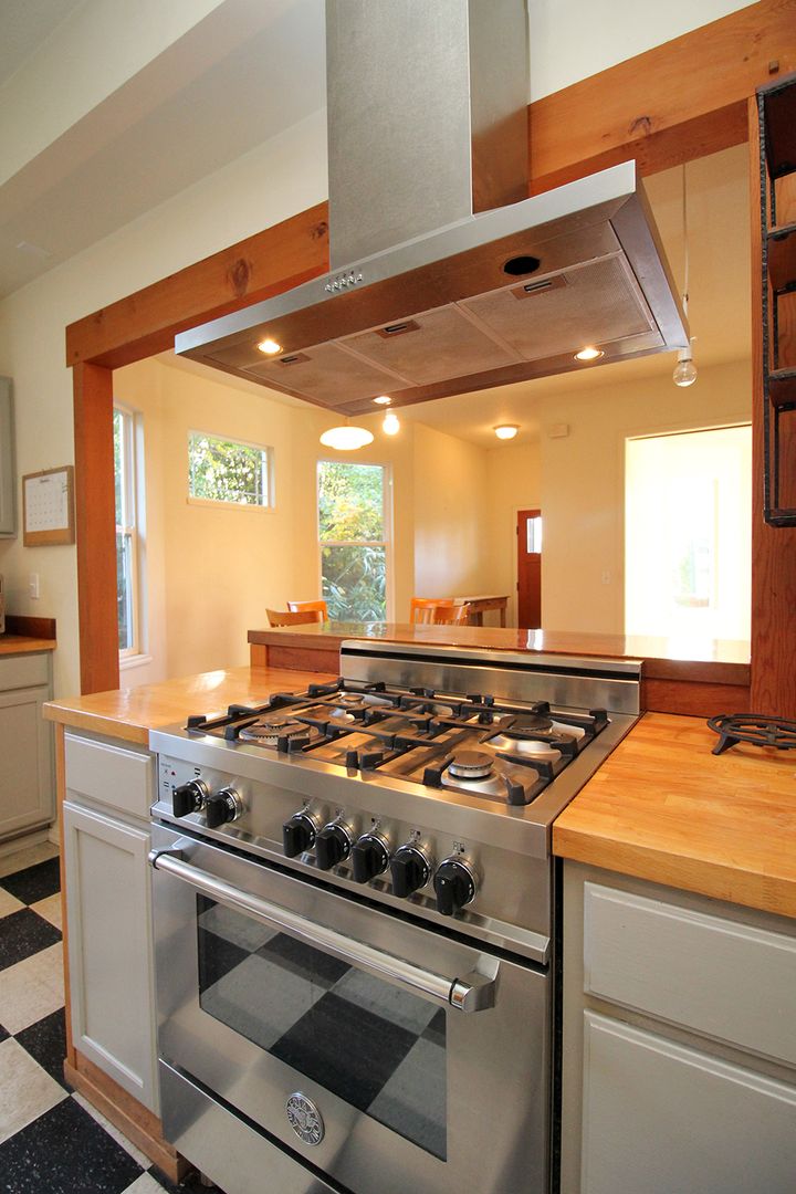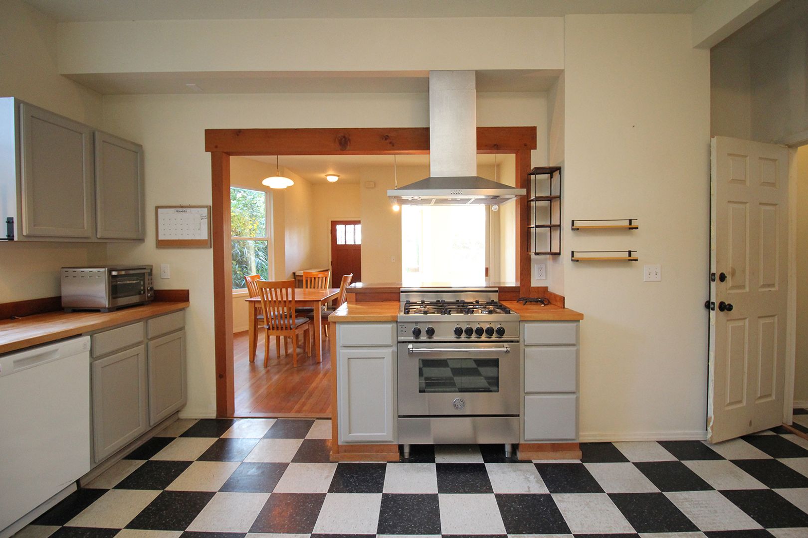 • Remodeled Kitchen with newer cabinetry, butcher-block counters, classic black and white flooring, and a pro-series gas range. There’s even room for a table.